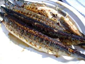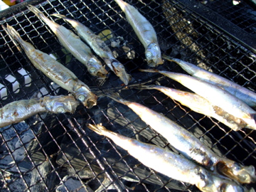 これは秋刀魚の塩焼き。まるごと焼いてありますが、焼き加減が絶妙!お天気はいいし、海を眺めながら美味しいビールと肴をいただいて、最高です☆