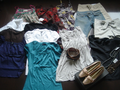 ワンピース3着、トップス7着、ボトム4着、靴1足、ネックレス2つ、ベルト1つ。