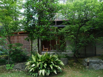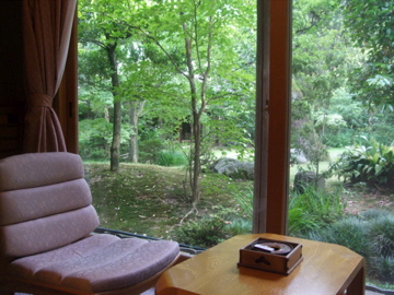 お庭からお部屋をみたところ。緑がきれいです。お庭を散策する人もいるので部屋の中が隠れるように木を配置してあるんですね。