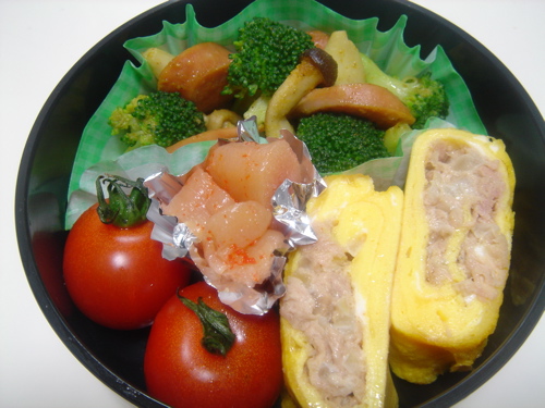 隙間をうめるべく、彩り野菜のプチトマトとご飯のおとも・辛子明太子をつめて出来上がり♪