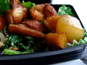 唐揚げの手前にあるのはさつまあげとこんにゃくの煮物。こんにゃくはノンカロリーですからね〜♪和風だし、酒、しょうゆ、みりんで炒め煮にしました。これは母が昔よく作ってくれたお弁当のおかずなんです。