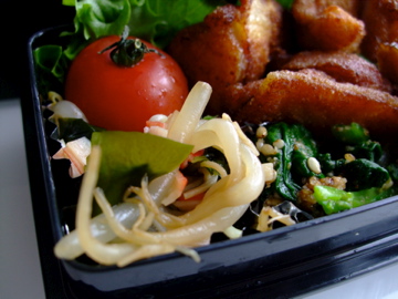 他はほうれん草のごま和え、もやしとわかめの酢の物(彩りを考えてかにかまを入れましたが、上手く写ってないですね)、ミニトマトとグリーンリーフです。
