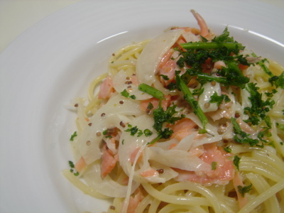 3)スモークサーモンを加えて、塩コショウで味をととのえて、茹でたてのパスタを加えてまぜあわせる。
