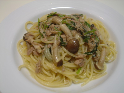 ツナとほうれん草、しめじを使って塩味のオイルパスタです。