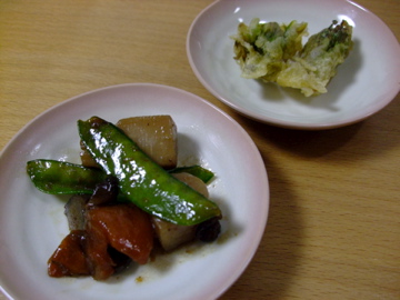 前日の残り物をつまみます。ふきのとうの天ぷらと筑前煮。