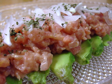 今回はアボカドは薄切りにして並べ、レモン汁をさっとかけます。その上にまぐろのタルタル(マヨネーズ、しょうゆ、塩こしょうで味付け)をのせ、新たまねぎ、パセリをかざってできあがり♪