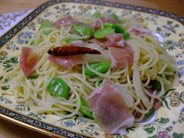 お昼にしっかりと食べたお休みの夜、いただいた生ハムと空豆を使ってパスタにしました〜。