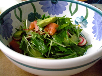 水菜、スモークサーモン、アボカド、ラディッシュが入っています。