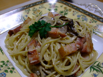 オリーブオイルでにんにくのみじんぎりとベーコンをじっくり炒めて、舞茸を加えたら生クリームとパスタのゆで汁を加えてソースを作ります。塩こしょうで味をととのえて、茹でたてのパスタを混ぜ合わせ、イタリアンパセリを飾ってできあがり♪