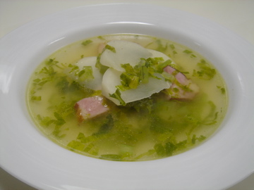 時間がたってしまったので葉の緑色がくすんでいますが、できたては鮮やかな緑とかぶの白とベーコンのピンクがとってもきれいなスープでした。お見せできなくて残念。セロリの葉が入ることで香りがとってもよくなりました。