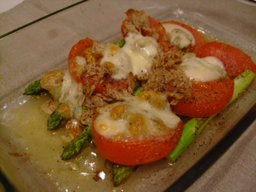 オーブンにおまかせの超簡単レシピですが、アスパラはほどよくシャキシャキしているし、トマト、ツナ、チーズ、そして塩こしょうと野菜から出た甘みが混ざりあって味は抜群!(ってちょっといい過ぎかな?!)とろ〜り溶けたモッツァレラもいい感じです。やっぱり加熱したモッツァレラは美味しいな〜。