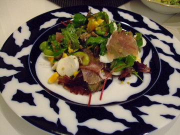 ゆで空豆、ゆで卵、生ハム、ミックスリーフ、黒オリーブをオリーブオイル、アンチョビのみじんぎり、塩、こしょう、レモン汁で和えました。