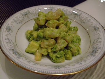 ゆでたむきえび、アボカド、細かく切ったセロリの葉、レモン汁、白ワイン、塩こしょう、マヨネーズ(少量)を混ぜ合わせただけの簡単サラダです。