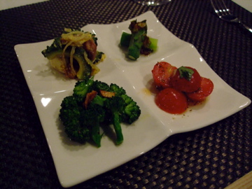 右上から時計回りに、アスパラのねぎ油がけ、ミニトマトのマリネ、ブロッコリーのアーリオオリーオ、ゴーヤチャンプルーです。
