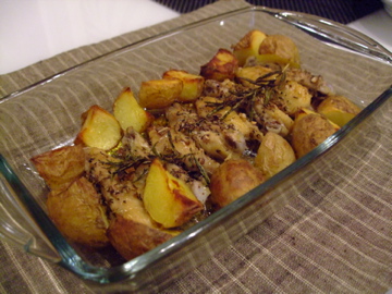 鶏のスペアリブ(手羽中)をオリーブオイル、にんにく、ローズマリー、タイム、塩こしょうでマリネして、レンジでチンした新じゃがいもと一緒にオーブンで焼きました。