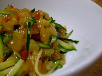 中華クラゲときゅうりのせんぎりをボウルに入れて、酢、ごま油、しょうゆ、白ごまを加えてあじを整えたらできあがり♪