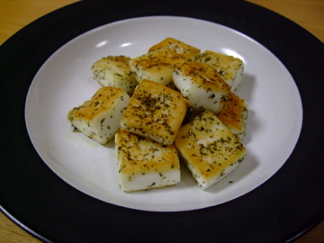 レシピブログ本のレシピです。はんぺんを小さく切って、粉チーズとパセリをまぶしてフライパンで焼くだけだったかな。