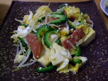 スパム、ゴーヤ、もやし、豆腐、卵で作りました。