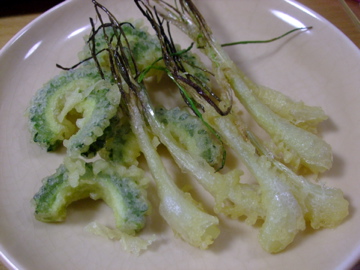 ゴーヤの天ぷらもおいしい、とどこかで聞いたことがあったのでゴーヤと島らっきょうの天ぷら。今回は衣をうすくして。