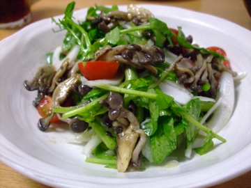 ひらたけしめじはフライパンでオリーブオイル、にんにくでさっと炒めて、残った油はドレッシングに使いました。ほかにはミニトマトとうすぎりたまねぎが入っています。