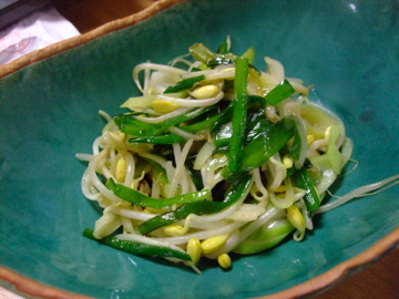 子大豆もやしとニラをウェイパーと塩こしょうで炒めただけ。