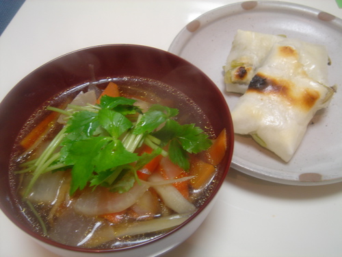 材料は短冊切りにして、鶏と鮭でだしをとって、お塩とお醤油少々で味付けします。