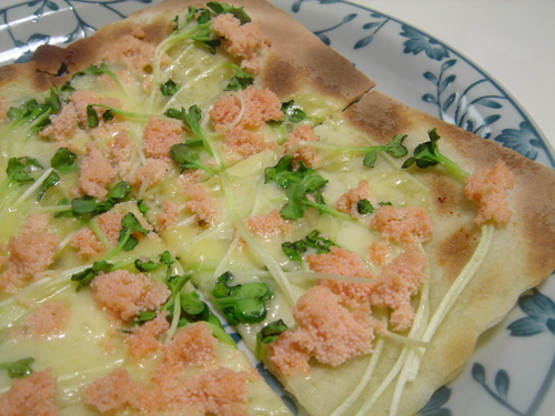 春巻きピザ、辛子明太子にかいわれ大根、チーズの組み合わせがたまりません~!