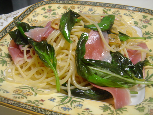 レシピはアーリオ・オーリオを作って、そこに生ハムとバジルを加えただけのシンプルパスタです。どちらも少し火が入って色が変わってますね。余熱だけなんだけどなぁ。