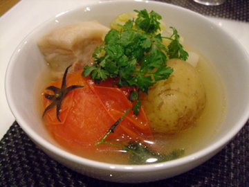新じゃがいも、たまねぎ、トマト、ゆで豚、ゆで豚の煮汁をル・クルーゼでコトコトと煮込み、塩こしょうで味をととのえ、チャービルをたっぷりのせました。