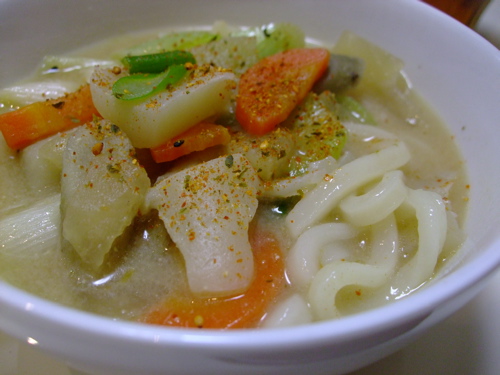 3)別の鍋でゆでたうどんを器にもって、けんちん汁をかけ、七味唐辛子をふってできあがり♪