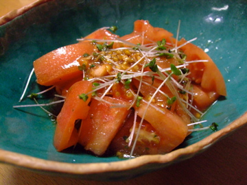 ざく切りにしたトマトをごま油、黒酢、砂糖、しょうゆでマリネして、ブロッコリースプラウトを散らしました。