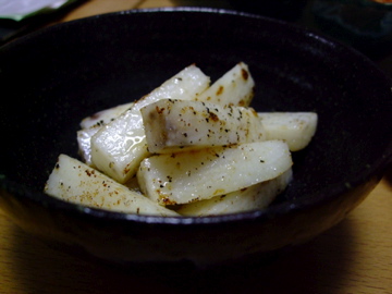 切った山芋をごま油で炒め、酒、塩、黒こしょうで味付けしたもの。