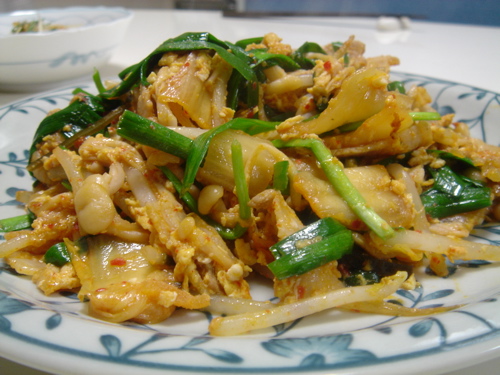 キムチ炒めですが、最後に溶き卵を加えてマイルドにしてあります。