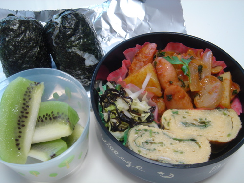 ソーセージと野菜のトマト炒め、三つ葉入り卵焼き、キャベツの塩昆布もみ、デザートはキウイです。