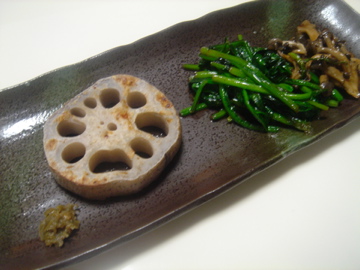 焼きれんこん(左)とほうれん草とひらたけしめじのソテー(右)。
