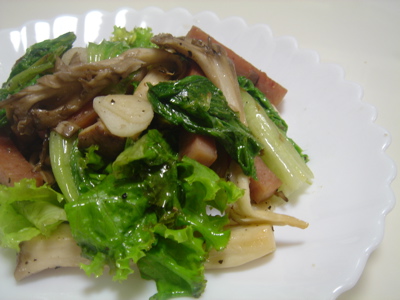 スパム、舞茸、エリンギ、レタスをオリーブオイルとニンニクで炒めて塩こしょうで味付けしました。レタスを炒めたのは初めてだったかもしれませんが、こういうのもアリだな、と思いました。