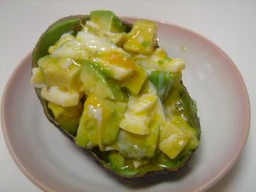 縦半分に割って中身をくり抜いたアボカドをさいの目状に切って、同じくさいの目に切った半熟卵と和えました。塩こしょうで味付けしてアボカドの皮に盛ってできあがり♪