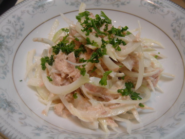 スライスしたたまねぎを水でさらしておき、ツナ、クレイジーソルト、マヨネーズ、こしょうであえ、パセリのみじん切りを散らしてできあがり♪