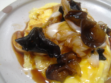 材料はきくらげ、ねぎ、卵。ねぎと水で戻したきくらげをごま油で炒めて、砂糖、酒、しょうゆで味付けて、ふわふわ卵にのっけるだけ。