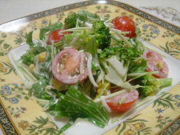 私のはブロッコリー、水菜、コーン、トマトをマヨネーズと塩、レモン汁であえたカラフルマヨサラダです。