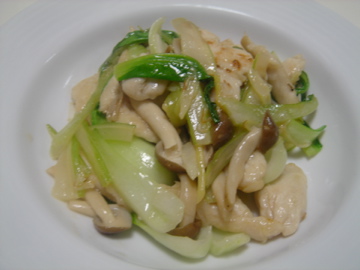 3)セロリ、しめじ、青梗菜の茎を炒め、酒、ウェイパー、塩こしょうで味付け。