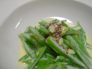 ボウルにマスタード、マヨネーズ、オリーブオイル、塩こしょうでドレッシングを作り、茹でてななめに薄く切ったモロッコインゲンを混ぜ合わせました。
