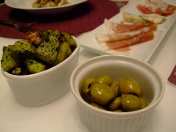 たことじゃがいものジェノベーゼ、アンチョビオリーブ、生ハムとゴルゴンゾーラチーズ。