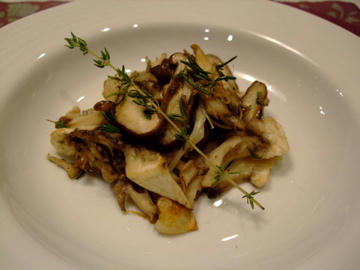舞茸、えのき、しいたけをにんにく、赤唐辛子で香りづけしたオリーブオイルで炒めて、そこへタイム、ローズマリーを入れ、クレイジーソルト、こしょうで味付けしてできあがり♪