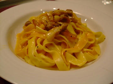 生のフェットチーネと買ってきたばかりのパルミジャーノを使っていますが、これが本当に美味しかったのです。生麺って今まで何度か食べましたが、これはものすごく美味しかった!プレーンの他に、トマト、ほうれん草、いかすみのフェットチーネを買ってきたのですが、この日はプレーンとトマトの2色を混ぜて使いました。少し色が濃く見えるのがトマトです。カルボナーラの味も濃かったのでトマトの香りはよくわかりませんでしたが、見た目にもキレイだったし、なんといっても美味しくて大変満足しました。