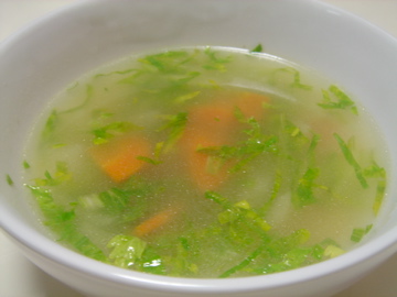 鍋にお湯を沸騰させてウェイパーを溶かし、薄く切った人参、セロリの茎を入れて煮る。最後にセロリの葉を小さく切ったものをバラバラと散らしてできあがり♪