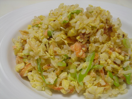 3)フライパンにごま油を熱し、ねぎを炒める。そこへ2)を加えよく炒める。途中鮭、ウェイパー、塩こしょうを加えてパラパラになったらできあがり♪