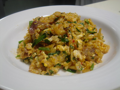 豚肉、ニラ、キムチ、ご飯、卵をごま油で炒めました。