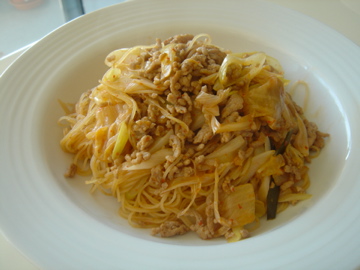 冷蔵庫にあったひき肉とねぎとキムチでビーフンを炒めました。
