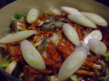 ル・クルーゼに白菜を並べて、その上にはまぐり、しめじ、白菜キムチ、牡蠣、コチュジャンダレ(コチュジャン、唐辛子、にんにく、しょうが、ねぎ、砂糖、ごま油、しょうゆを和えたもの)、ねぎを並べたらお水を適量加えて火にかけます。